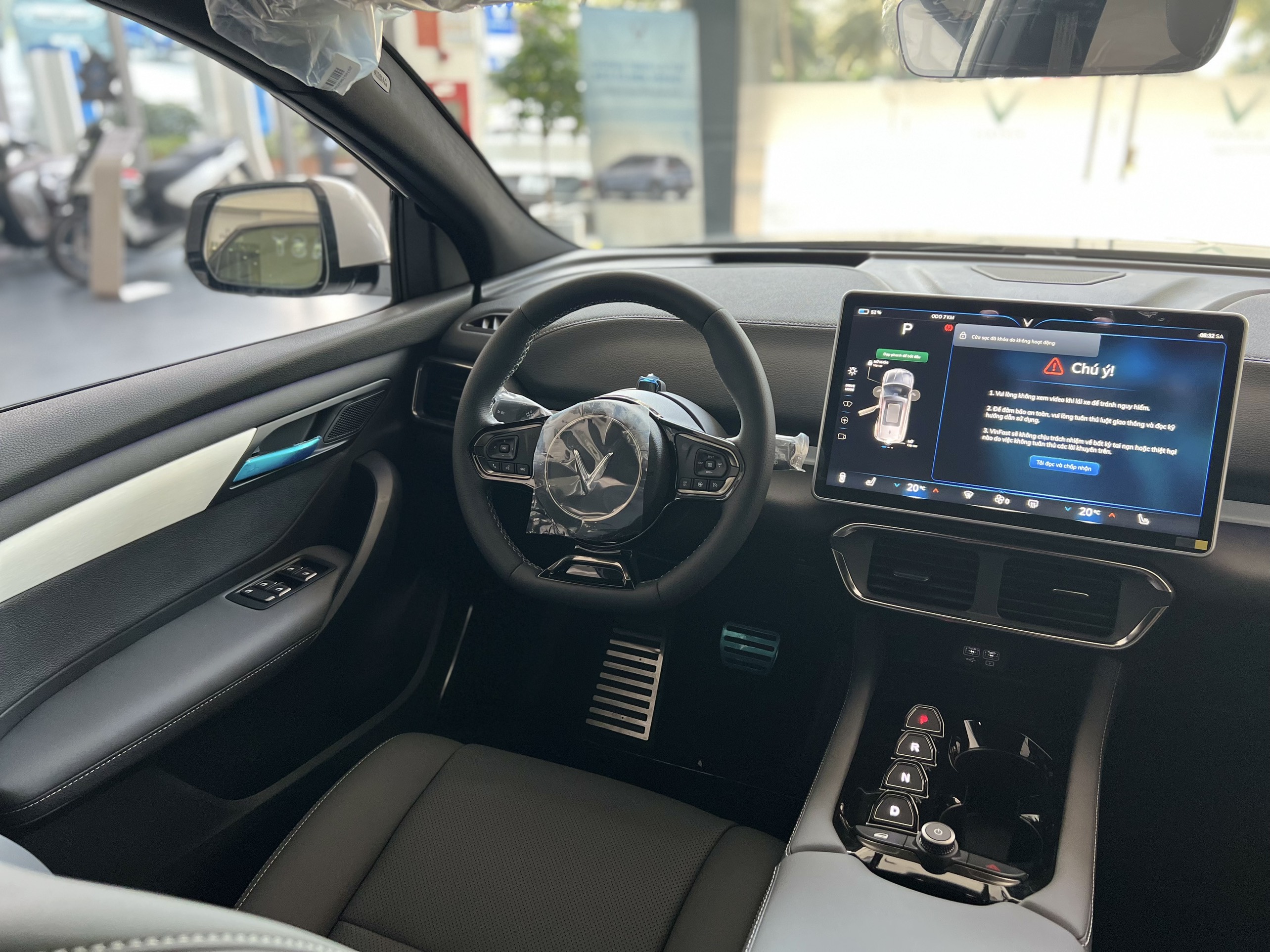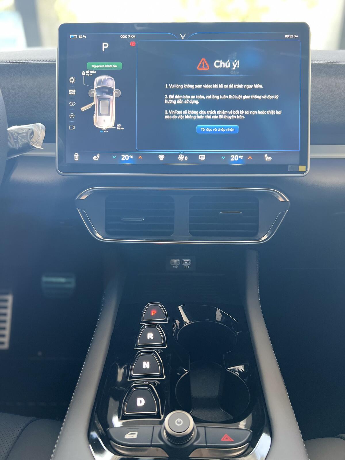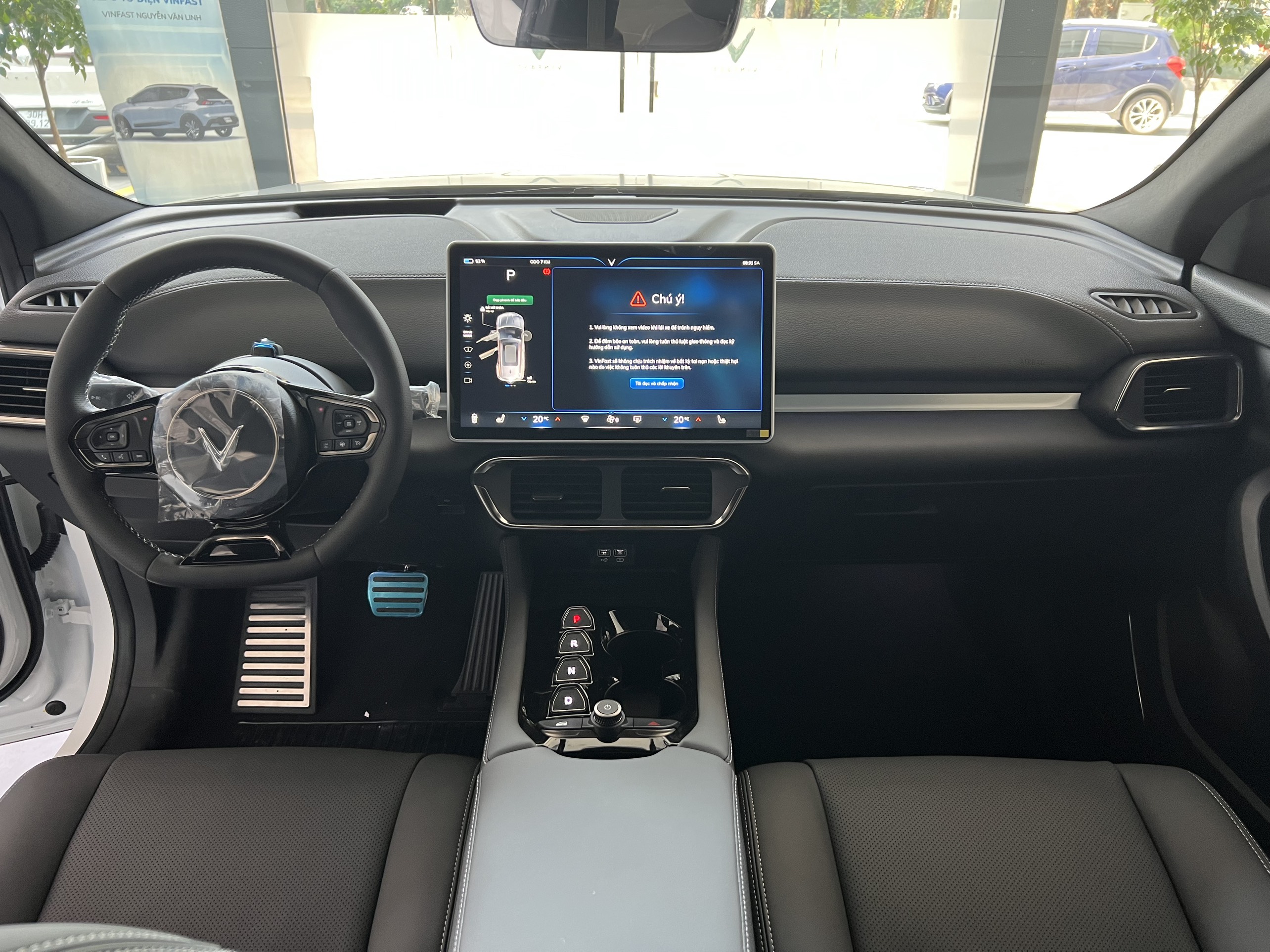 Trung tâm là màn hình cảm ứng kích thước 15,6 inch hiển thị sắc nét. Màn hình này tích hợp hệ thống giải trí, dàn âm thanh 8 loa trên phiên bản Eco. Trong khi đó, cụm chuyển số sử dụng các phím bấm điện tử, thiết kế mô phỏng hình ảnh ruộng bậc thang. Điều hòa tự động hai vùng có lọc không khí. Trên phiên bản VinFast VF8 Eco không có cửa sổ trời.