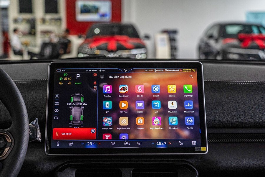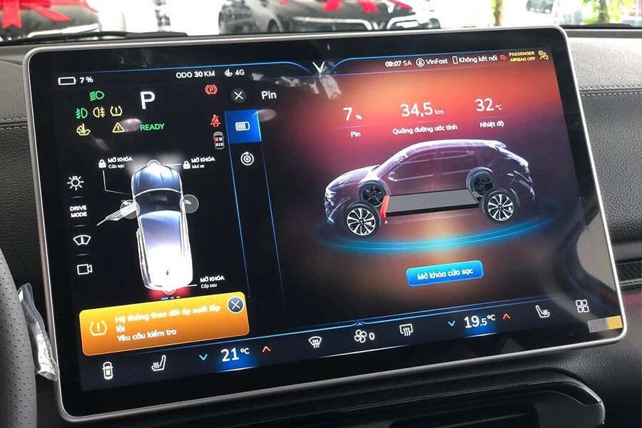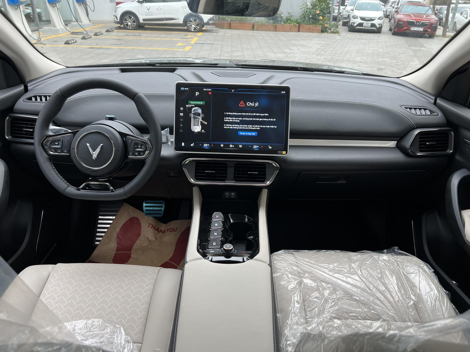 Trung tâm là màn hình cảm ứng kích thước 15,6 inch hiển thị sắc nét. Màn hình này tích hợp hệ thống giải trí, dàn âm thanh 8 loa trên phiên bản Eco. Trong khi đó, cụm chuyển số sử dụng các phím bấm điện tử, thiết kế mô phỏng hình ảnh ruộng bậc thang. Điều hòa tự động hai vùng có lọc không khí. Trên phiên bản VinFast VF8 Eco không có cửa sổ trời.
