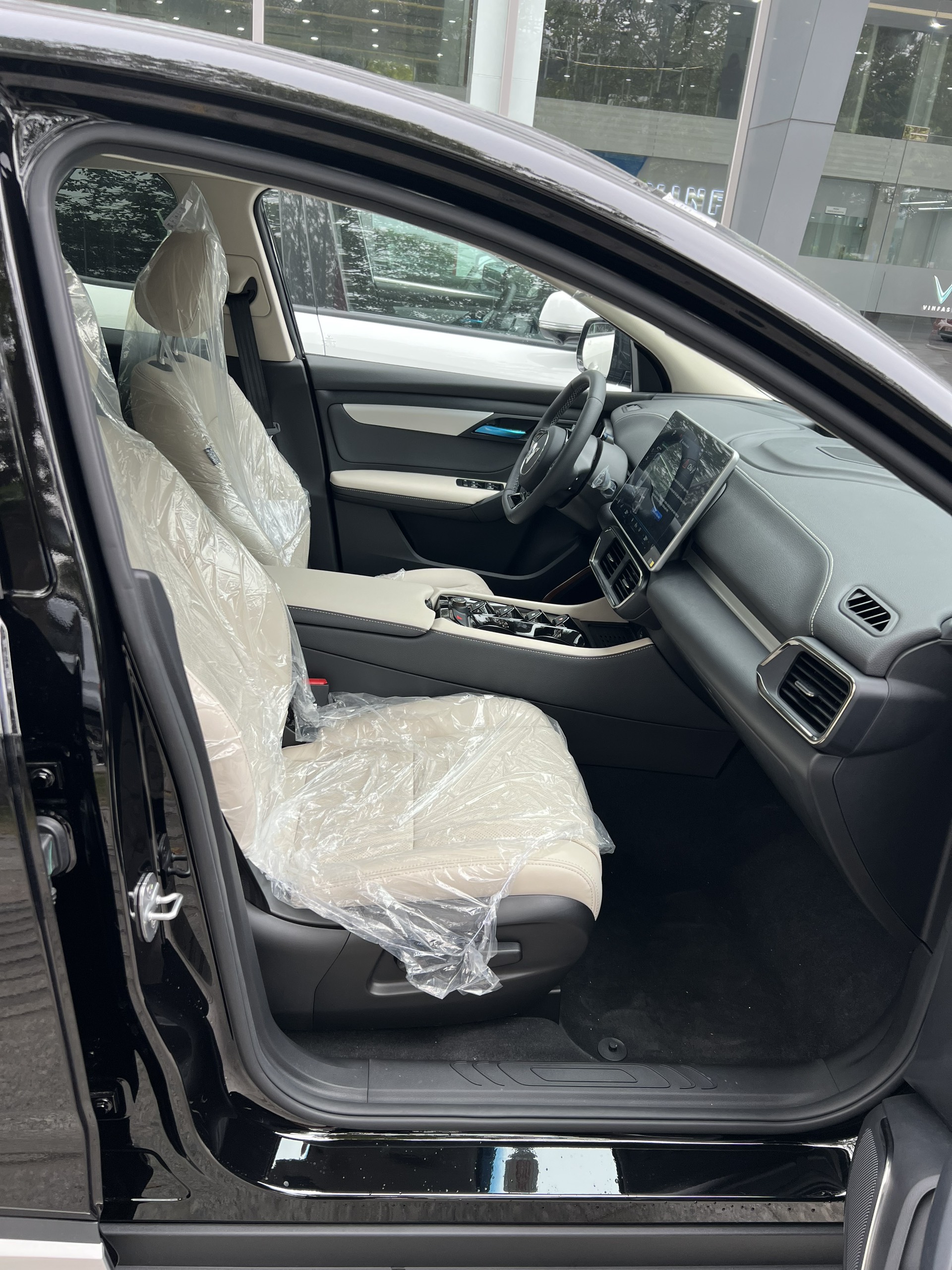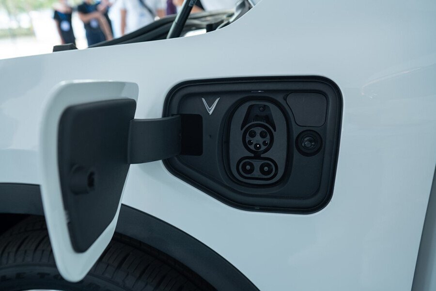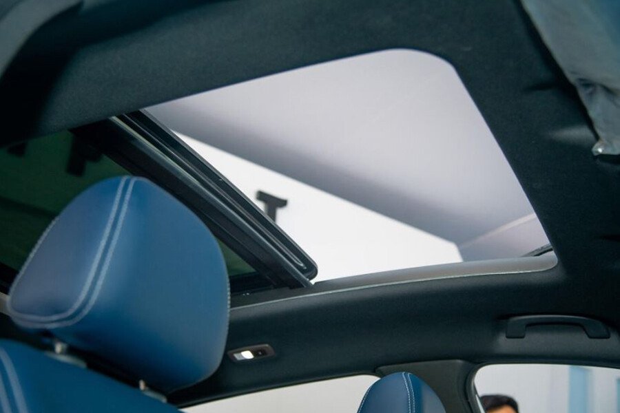 VF 8 là mẫu ô tô đầu tiên của VinFast có cửa sổ trời và là loại toàn cảnh với phần kính chiếm hầu hết trần xe. Hành khách ở hàng ghế phía sau có cửa gió điều hòa riêng, hai cổng USB Type A và một cổng USB-C công suất 90W – đủ nguồn để sạc cho phần lớn các thiết bị di động, bao gồm cả MacBook Pro 16.