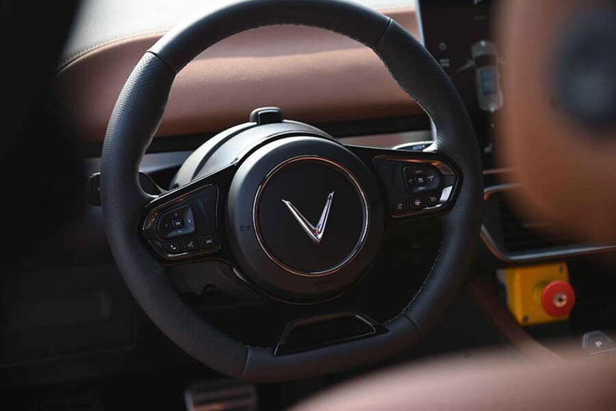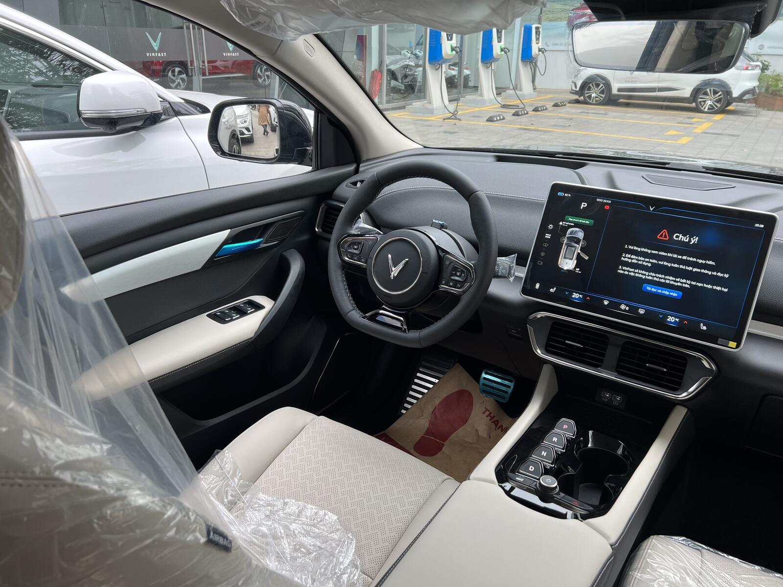 Nội thất VinFast VF8 Plus có ghế ngồi bọc vật liệu giả da toàn bộ, hàng ghế trước có tính năng sưởi, ghế lái chỉnh điện 8 hướng, ghế phụ chỉnh điện 6 hướng. Vô-lăng ba chấu tích hợp các phím bấm và chức năng sưởi. Phía sau vô-lăng không có đồng hồ hiển thị tốc độ và vòng tua như thường thấy. Thay vào đó, các thông tin hiển thị lên kính lái để tài xế tiện quan sát.